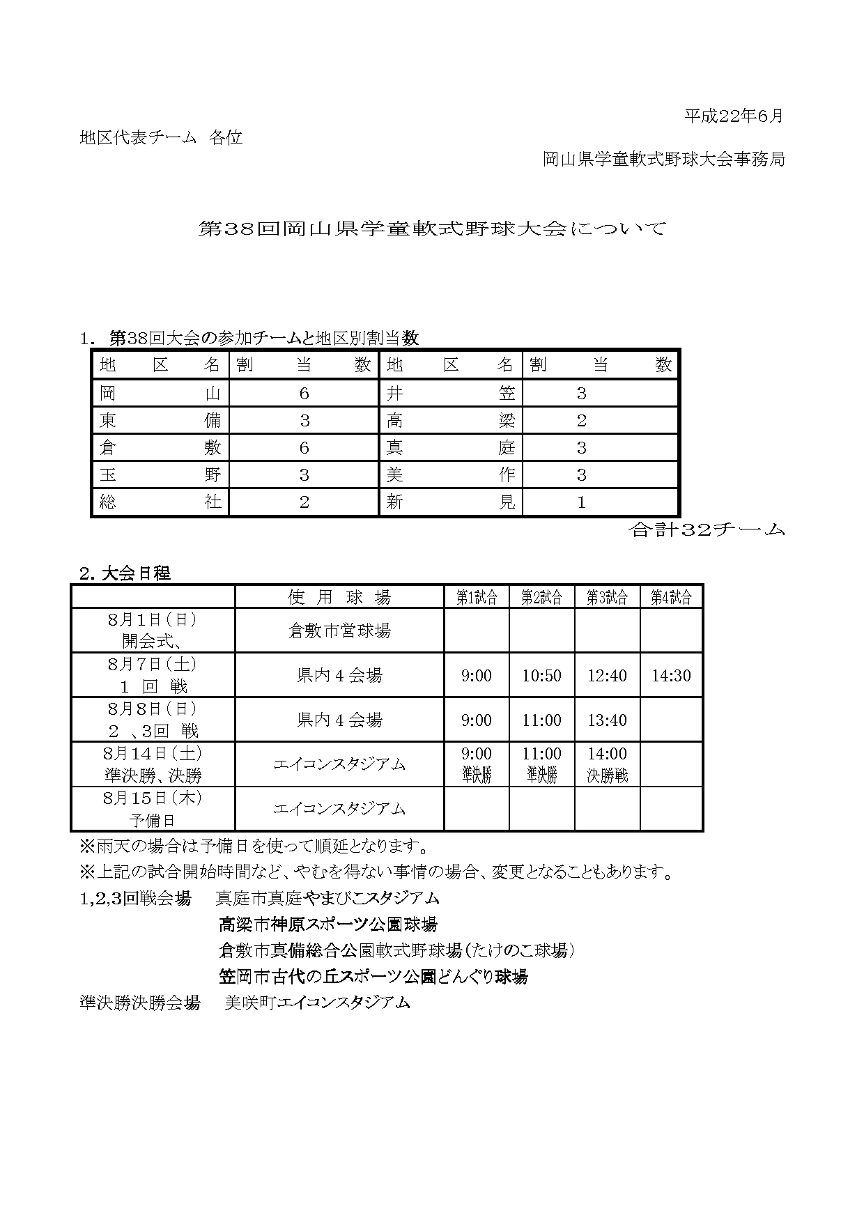 14:00〜 第38回岡山県学童軟式野球大会 監督会議・抽選会